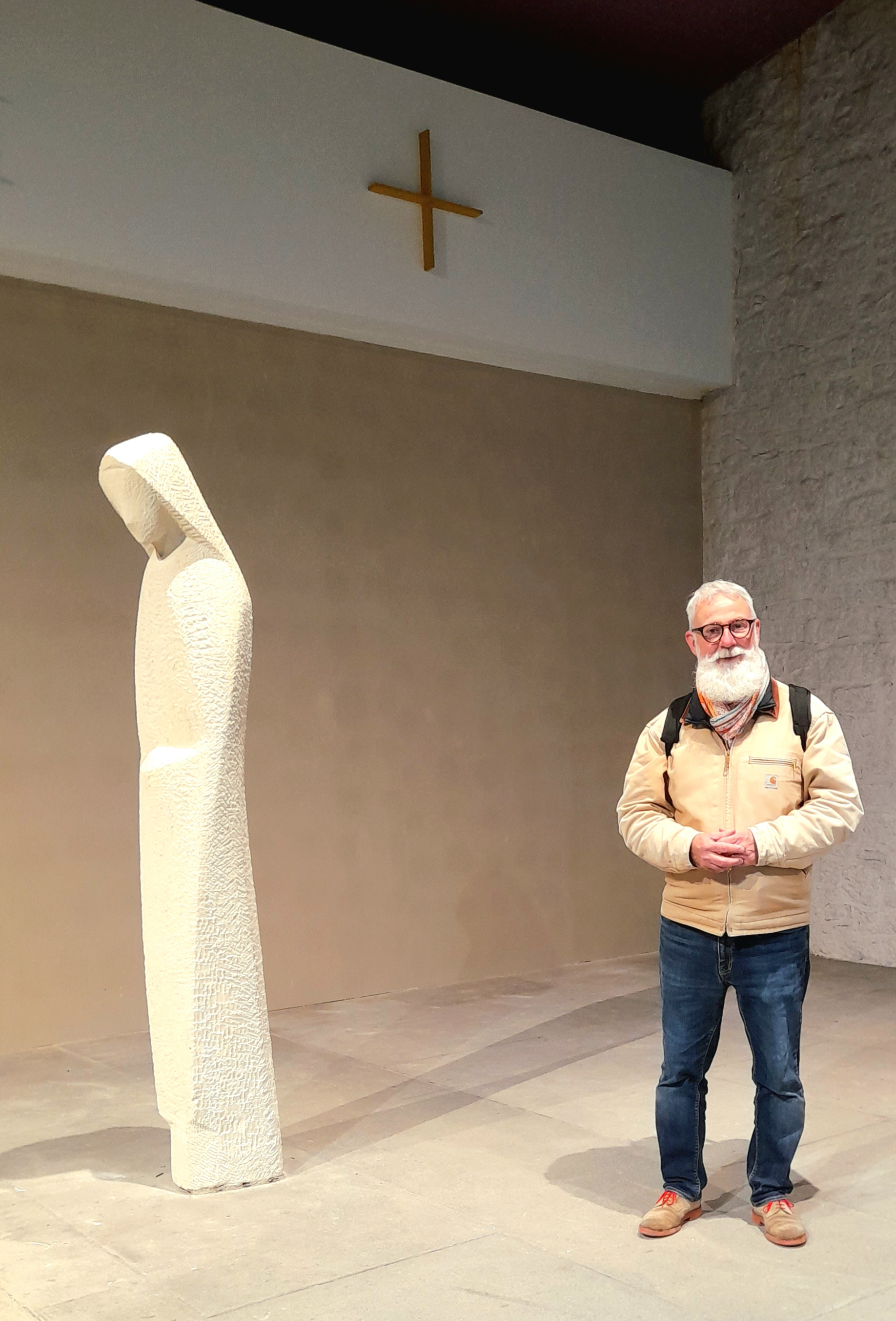 Works began in March 1957 and the consecration ceremony led by Cardinal Roques was held in May 1958. Francis Pellerin’s contributions included a door in polychrome wood with a geometric abstract composition, a stained-glass window, a baptistry, an altar in slate, an altarpiece of Christ crucified in wood, and statues of the Virgin and Saint Yves. He also created an abstract Stations of the Cross in polychrome wood, and spoke of “ideograms that could benefit mediation”.